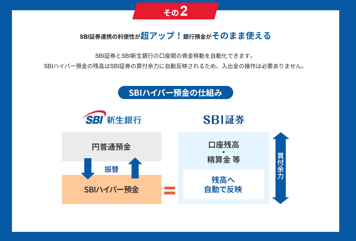 これは住信SBI銀行で言うとハイブリッド預金と同じもので、残高がSBI証券の買付余力として反映される口座です。